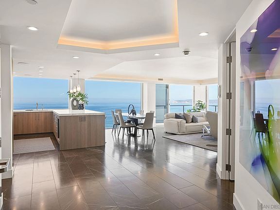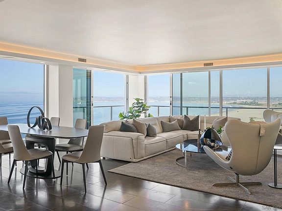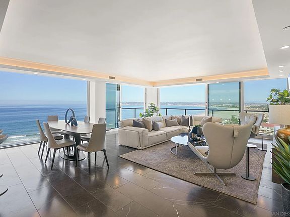Rising high above the coastline on the 14th floor, this rare 3-bedroom, 3-bath Coronado Shores oceanfront residence embodies the pinnacle of sophisticated coastal living. A custom large-format picture window serves as the home’s centerpiece, framing sweeping unobstructed views of the Pacific Ocean, Point Loma, and the iconic Hotel Del Coronado. Inside the residence is a showcase of refined design, featuring dramatic Black Marquita marble tile floors, sleek Neolith porcelain countertops, and European laminate cabinetry with precision-engineered Legrabox drawers by Blum. The chef’s kitchen is equipped with premium Miele appliances, while a custom integrated sound system provides the perfect backdrop for both elegant entertaining and serene daily living. Beyond the residence, the Coronado Shores offers an exclusive lifestyle with oceanfront pools, tennis courts, pickleball courts, a private clubhouse, and 24-hour security, all just steps from Coronado’s world renowned beaches, fine dining, boutique shopping, and legendary Hotel Del Coronado. Blending timeless elegance, modern luxury, and a premier oceanfront address, this extraordinary property is designed for those seeking a one-of-a-kind coastal retreat. Schedule your private viewing today and experience the height of ocean-front Coronado living.