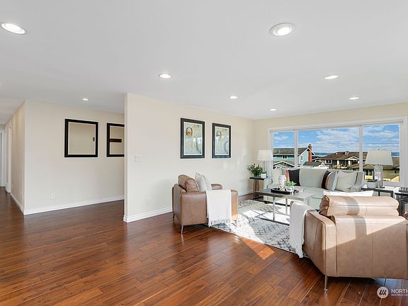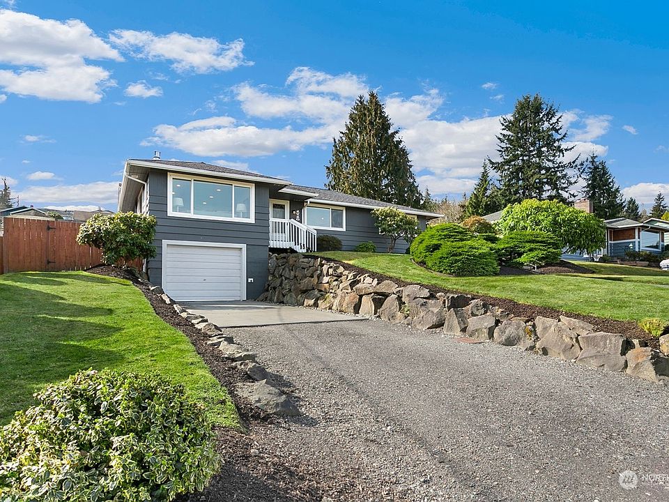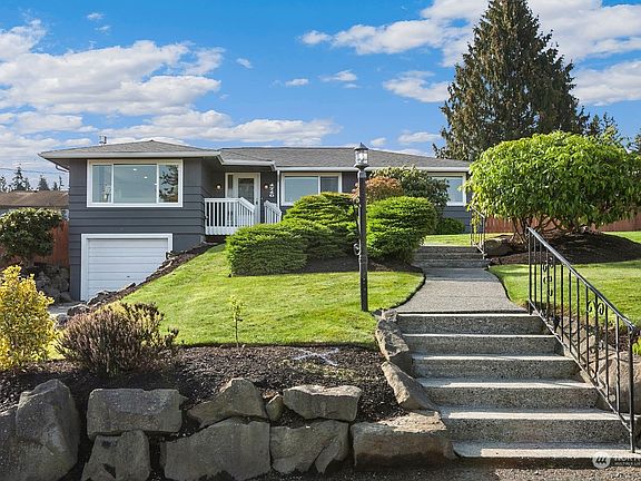 Light abounds from this tastefully updated mid-century daylight rambler with Sound and Mt. Baker views. Enter on the main floor & be greeted by a spacious kitchen with quartz counters, gas cook-top, & views of the tranquil backyard through the delightful sunroom. Dining room & cozy living room both look out towards water & mountain views. Primary bedroom with en-suite bath, addt’l full bath, & 2 guest rooms round out main-floor. Downstairs you’ll find an expansive rec/game room, an addt’l bed/bonus room, laundry, & full bath. Attached 2-car tandem garage. Conveniently located off the Mukilteo Blvd. steps from Haborview Park. Brand new roof, A/C, large composite back deck, and meticulously-manicured landscaping complete this beautiful home.
