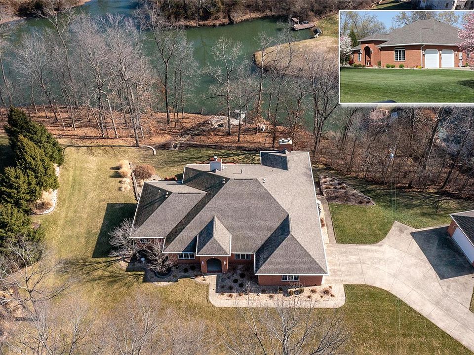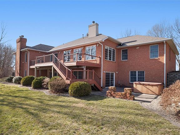 LAKE LOT IN OFALLON! Full brick home, 2+ acres & lake. Spacious entry opens to large dining & living rooms w/fireplace. Kitchen opens to separate family & hearth rooms, both w/fireplaces and lake views. Kitchen: cabinets w/crown, solid surface counters, stainless appliances, island w/gas cooktop, breakfast bar peninsula, walk in pantry, & eat in breakfast w/door to 38 x 15 deck. Split Master Suite: master w/walk in closet & bath: double vanity, linen stack, corner tub, separate shower, 2nd walk in closet. Large guest; full hall bath. Other side of home: 2 guest beds share 3rd full bath. Finished walkout basement: massive family room w/fireplace, full wet bar. Bonus rm: gym w/2 walk in storage closets, 5th bedrm w/walk in closet, bonus rm, add'l walk in closet, guest bath, office, LOTS of unfinished storage. Beautiful custom landscaping w/custom stone stairs lead to the lake side fire pit & dock. Oversized 4 car garage: 2 car attached & detached brick 2-car garage.