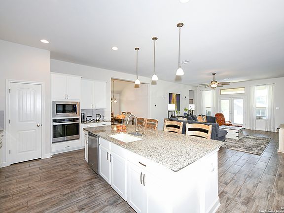 Welcome to your new home! Featuring energy-saving solar panels, a spacious 3 car garage, a hot water Recirculation System with a programmable timer for near instant hot water, and a whole house water softener paired with a Reverse osmosis drinking water system for clean, great tasting water that is easy on fixtures! The large and inviting entry way with high ceilings and abundant natural light enhance the sense of openness, giving way to the common areas where each room opens to another. This beautifully designed open floor plan seamlessly connects the kitchen, dining and living areas, creating the perfect space for modern living, entertaining, or just relaxing. The chef inspired kitchen features an oversized island and overlooks a spacious thoughtfully designed family room as well as a distinctive retreat area with stylish Barn doors. The luxurious Primary suite includes a generously sized custom closet for ultimate convenience and organization. Step from the family room through elegant French doors onto a spacious covered extended patio perfect for outdoor living. Just beyond, enjoy a swim/spa pool and a low maintenance backyard complete with a storage shed. Located just off Potranco Rd. a few short miles outside Loop 1604, this home is close to everything but feels more like a get-a-way. With shopping, eateries, hospitals, great schools, and easy access to several highways, your new home awaits!