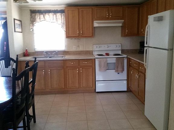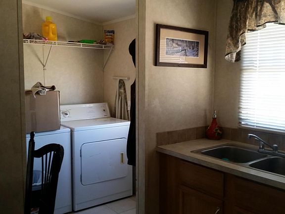 Easy living home features a master suite with 3/4 bath, dual vanities, walk in closet, seperate from other 2 bedrooms and full bath. Nice white kitchen appliances with eat in dining area, washer and dryer laundry area just off kitchen. Vaulted ceilings, with fans, cool A/C. Extra storage closets. Front yard has pavers and fire pit and beautiful grassy area. Plenty of parking, RVS okay. NO HOA. Come see this cute home value priced under 100K.