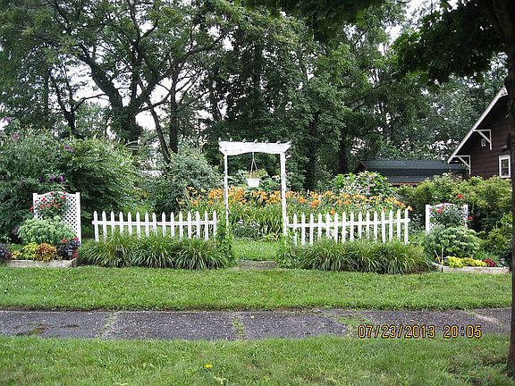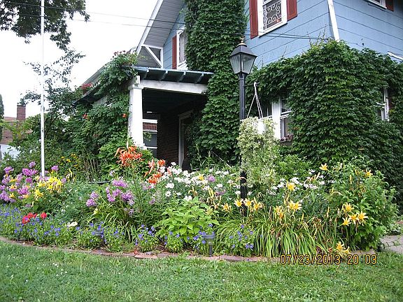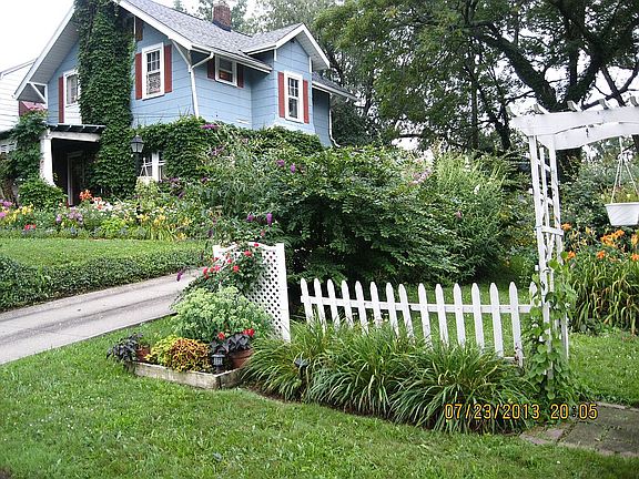 All beautiful, original unpainted woodwork. Built in bookcases, stained glass window, picture molding, hardwood floors. Beautifully landscaped double lot property with two garden ponds, a large vegetable garden and may flowers and shrubs. Rear deck with gazebo and front porch. large 9' x 26' kitchen/dining area. Five year old 1 1/2 car garage.