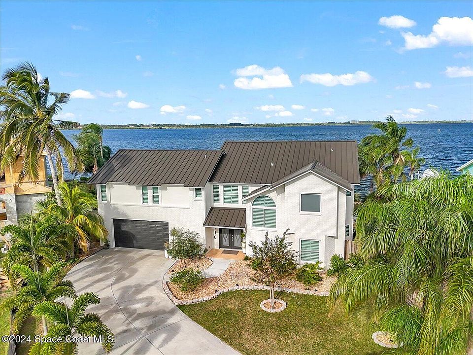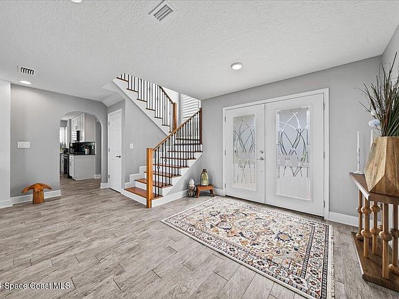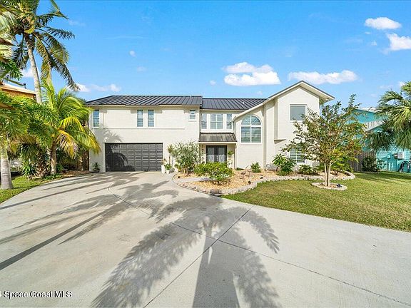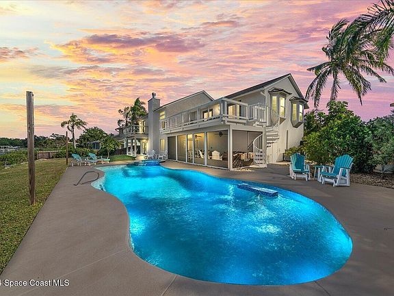 Discover the epitome of waterfront elegance in this Space Coast intracoastal home. As you enter the residence you are greeted by a light filled haven with soaring 24ft ceilings and exceptional water views through the impact glass. This 4-bed, 3-bath home features an open floor plan that is perfect for entertaining. Every inch has been thoughtfully updated, including a sleek, fully modernized kitchen and luxurious bathrooms. The primary suite has vaulted ceilings, massive walk in shower and it's own private porch. Multiple upper decks and a downstairs screened porch invite you to savor the outdoors and gentle breezes year-round. The expansive backyard is a private paradise. A large pool and hot tub are complemented by multiple sitting areas along the water, perfect for soaking in the scenery and watching the mesmerizing sunsets go down every evening. Its private dock includes a 12k covered lift, ensuring your boat is ready for any adventure on the water. Schedule a private tour today