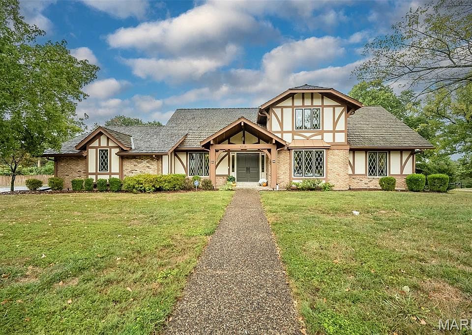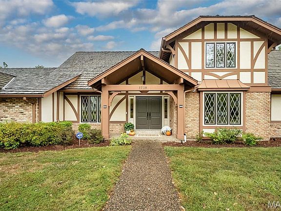Simply SPECTACULAR! Welcome to 1710 Lynkirk Lane ~ a unique "Chalet-like" architectural gem that's perfectly positioned on a gorgeous .50 acre lot in the coveted Briar Hill Farm Subdivision! This 1 1/2 story stunner proudly boasts 3200+ sq. ft. with 5 bedrooms, 3 1/2 baths and exudes a one-of-a kind style and personality plus! Be greeted by the grand entry that is the perfect precursor to what lies within: formal dining room with chic chandelier, classy sitting room/study that leads into the STUNNING great room with soaring 20 ft. ceilings and distinctive Tudor accents that consist of rough sawn wood, angles, arches and beams that creatively define it's dramatic space. The focal fireplace is a true showstopper and is flanked by floor to ceiling windows, French doors and a wet bar that's perfect for entertaining. The sunny eat-in kitchen is very attractive with custom wood cabinetry, rich granite countertops, sleek subway backsplash, stainless appliance package, pantry and easy access to the laundry/mud room! You will LOVE the spacious MAIN FLOOR primary suite that is oh-so dreamy: large walk-in closet, spa-like bathroom with beautiful travertine floors, double bowl cabinet vanity, oversized walk-in shower and linen closet. Head upstairs to find (3) expansive bedrooms that are each equipped with plenty of closet space, a neat "flex" loft-like area and a large hall bath with double bowl cabinet vanity and tub/shower combo. Need more space? No problem! The lower level is AMAZING: rec/media room that sports recessed lighting and custom built-ins, private ensuite with stylish designer vanity, walk-in shower and linen closet! There's an additional room that could be used as an office, workout area or sleeping area...lots of options! Not to miss: GORGEOUS refinished floors, beautiful fenced yard with patio, oversized 2-car garage, meticulously maintained systems, subdivision pool, tennis courts and private clubhouse, highly rated Kirkwood School District and a PRIMO location! Don't miss this one folks!