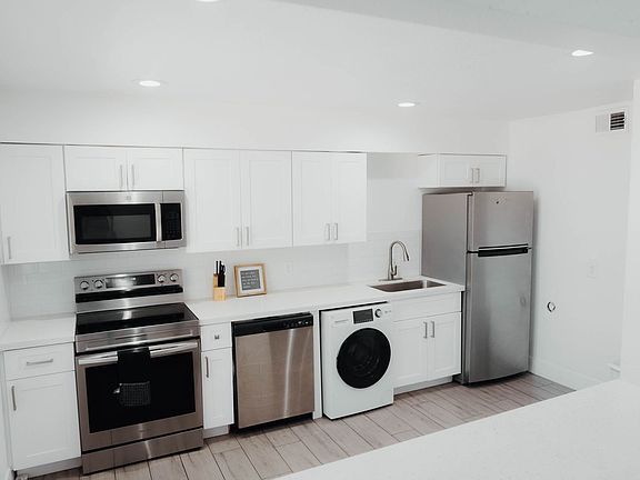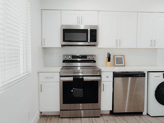 The kitchen opens into the living/dining area and features stainless-steel appliances, generous counter space, and cabinetry that maximizes storage. An island or peninsula may double as a breakfast bar.