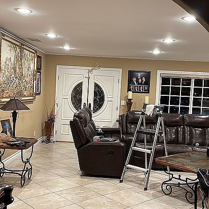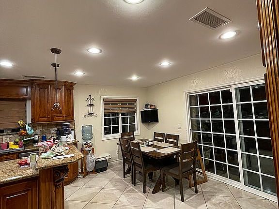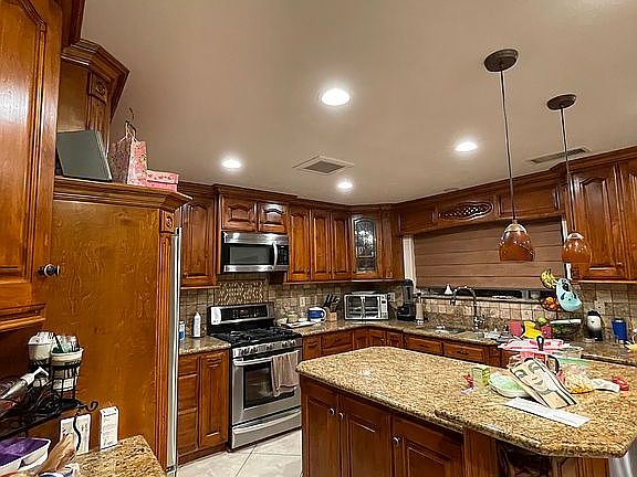 Two stories with all upstairs ingenier wood floors a full beautiful bathroom with porcelain lavsink and granite counter top all three main bedrooms with wall to wall custom made closets surround and data cables inside walls for tv or stereo system all ceiling fans doble glass vinyl windows and a forth bonus room you could use it as office, tv room or bedroom.staircase is also all wood an downstairs large tile floors in living room, dining room,kitchen and all way as well as in both full bathrooms the two bedrooms wooden floors and wall to wall custome made closets and sceilng fans. The living room has a beautiful built in tv and stereo system cabinet with beautiful hand work glass doors nd interior lights, the kitchen is brand new all real wood and the back of shelves are also cover with the same wood all habit counter tops stainless steel doble sink a beautiful kitchen faucet tall arch from kholer all new stainless steel appliances and middle island Alda a large cabinet use as pantry and the beautiful back splash finished with travertine tiles and a beautiful dising in back of stove. All tv, data, internet, phone, cable tv are inside the walls nothing expose or lose. The back patio has all concrete with design and a large patio cover for entreteinmet also arvy acces and the front drive way for four cars or up to five cars doble car garage with remote access. Laundry room in next to garage with two washing and two driying machines also up top of garage large attic storage area all copper pipes through the house. Tile Roof and front porch seating area. Doble custom made door entrance also with two dryers and two washers custom made connections.