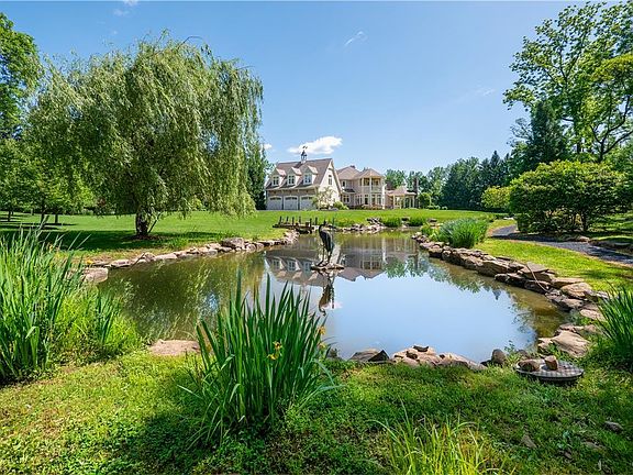 Nestled at the end of a tranquil drive, this EXQUISITE ESTATE sprawls across 4.13 acres of picturesque park-like grounds, tempting exploration along WHITE ACRE's exclusive private roads. This beautiful home is enhanced with MULTIPLE TERRACES, DECKS, and PORCHES, each offering panoramic vistas of the verdant lawn, a lovely PRIVATE GARDEN, and a serene POND adorned with a captivating stone WATERFALL and charming dock. An enchanting WALKING PATH circles the property inviting one to enjoy the out-of-doors. As you approach along the CIRCULAR DRIVE, the welcoming facade commands attention, evoking an inviting sense of timeless GRACE and REFINEMENT. Majestic pillars, a lustrous mahogany porch floor, and a grand entrance offer a glimpse into the luxuries within. Every facet of this remarkable residence showcases IMPECCABLE CRAFTSMANSHIP and FINE MATERIALS, seamlessly fusing timeless elegance with the convenience and innovation of modern bespoke construction. Adding to the unwavering attention to detail, lavish luxuries include a lower level THEATER, FITNESS ROOM, aromatherapy STEAM SHOWER, and spectacular HEATED SALTWATER POOL with SPA. A welcoming and well-appointed second level GUEST SUITE offers privacy and convenience with a KITCHENETTE and separate bedroom. Meticulously maintained, 1710 White Acre is the epitome of REFINED LIVING and awaits an owner who values unparalleled QUALITY. Discover the pinnacle of luxury living in SAUCON VALLEY, where this property reigns supreme.