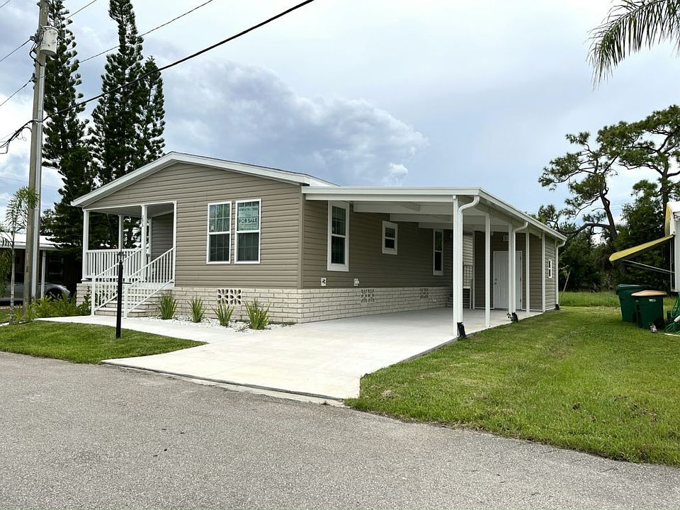 Welcome to Tropical Palms MH a 55+ age-qualified active and vibrant community, where you can find yourself in your dream home. We have a stunning, brand new 2025 3 bed, 2 bath home for sale featuring 1355.12 sq ft of beautifully designed living space. Located in/near Punta Gorda, this property offers the perfect blend of modern amenities and timeless charm. Step inside to find an open-concept floor plan with kitchen island, vaulted living room ceilings with ceiling fans, and plenty of natural light. The open kitchen boasts stainless steel appliances with plenty of room perfect for both everyday living and entertaining. The spacious primary suite offers a peaceful retreat, complete with en-suite features like dual sinks, walk-in shower, walk-in closet, etc. Additional bedrooms provide versatility for guests, a home office, or visiting family/friends. Outside you will enjoy a covered front porch ideal for entertaining or unwinding. Located in the desirable Tropical Palms MH, residents enjoy access to a range of premium amenities including a newly renovated pool that is screened in, a clubhouse that houses many events for the community (including bingo, cards, trivia, dances and more), shuffleboard courts, bocce ball courts, a dog park, billiards, library, a fishing pond with fountain and more. Conveniently situated between Punta Gorda and Fort Myers, you'll have everything you need just a small drive away while still having your little slice of heaven. Whether you're looking for relaxation or recreation, this community and the surrounding area has it all. Call today to schedule a tour!