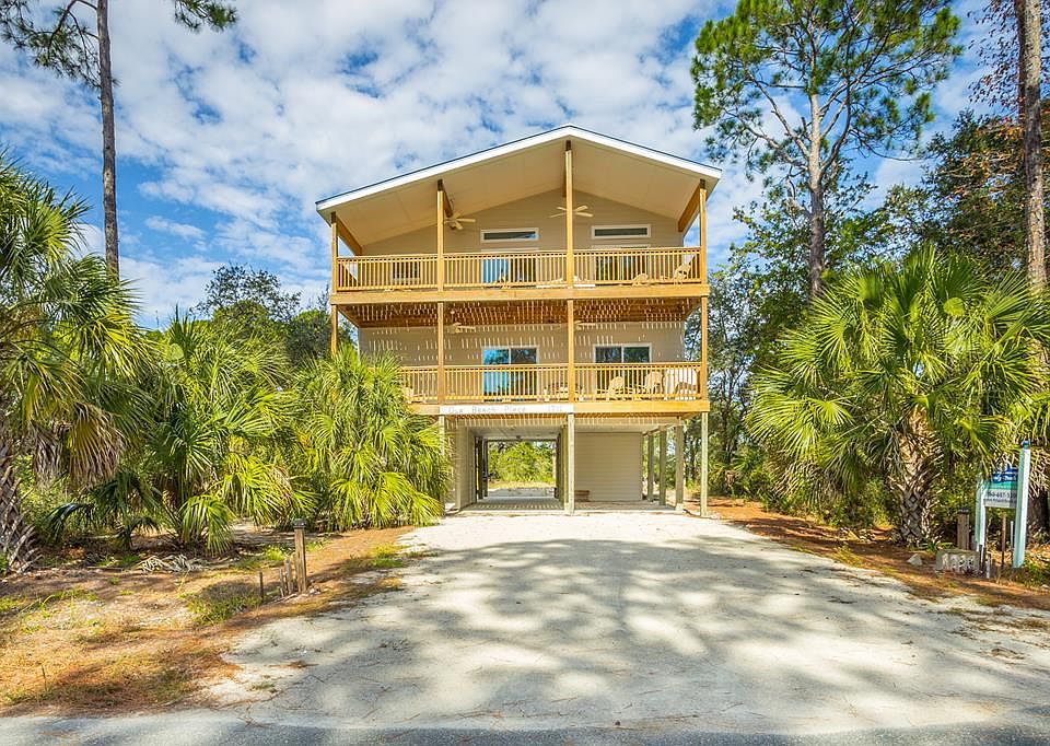 Beautiful Beach home with a view of the sunrises and sunsets along a beautiful stretch of easy walking, undeveloped, crescent, sugar white sand beach. Great location, just minutes to downtown Carrabelle, Saint George Island and Apalachicola . This quiet, private subdivision has plated beach access just across the street from this home. 3 Bedroom, 2 Bath, with outside shower. Home has Hardie Siding, Standing Seam Roof with secondary roof. High R-value foam insulation, strong, SIP panel construction. Kitchen has glass front uppers, soft close cabinet doors / drawers and solid surface countertops. 680sq' covered decks overlooking the water. Large Living and Dining area, Large Master Bed and Bath with mini kitchen upstairs. Pine ceilings and Bamboo interior walls. Covered Stairwell leading up to the first floor. Plenty of parking.