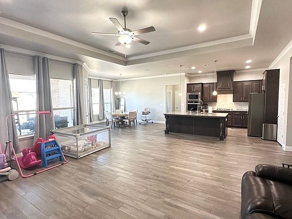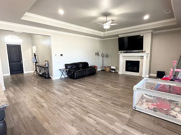 The gourmet kitchen is a chef's dream, equipped with double ovens and an oversized granite island, providing ample space for meal preparation and entertaining. The living area is a cozy retreat, featuring a 75" flat screen TV mounted above the fireplace, perfect for movie nights or catching the big game. This home offers a unique blend of convenience and luxury, making it a must-see for anyone looking to rent in the Midland area.