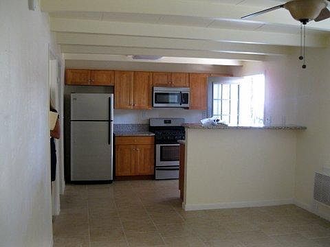 Renovated ground level charming 1 bedroom 1-bath PALM SPRINGS Efficient floor plan with living area open to a new kitchen, dining area and private backyard. Nice quiet small complex with only one common wall. This apartment has: Tile flooring throughout. Air condition New cabinets, sinks, granite countertop Light fixtures in kitchen and bath Toilet and wall-decorative tiles in bathrooms New paint everywhere Designated Parking 1 year lease with month to month at the end of the one year lease