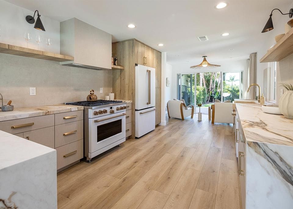 Stunning single-level coastal modern smart home with ocean views, cohesive upgrades, and an expansive backyard oasis in Fire Mountain, just minutes to the beach. Recently reimagined with high-end design in mind and curated by a professional artist. Filled with natural light, the home features open living, multiple seating areas, and an alcove dining room. The gourmet kitchen boasts two-tone linen and Halifax Oak cabinetry, luxury white Café appliances, and porcelain countertops. Sliding glass doors frame the kitchen and living areas from all sides, expanding the space to the wraparound yard, creating an indoor-outdoor lifestyle. The layout includes dual primary suites, each with an ensuite bath featuring decorative tile and custom lighting. Perfect for entertaining, the outdoor space offers a pool with water features, hot tub, raised seating with firepit, and multiple areas for dining & lounging, including a built-in bbq bar with Tahitian-style palapa. Additional highlights include owned solar, two Tesla batteries, EV charger, smart lighting and AV system with indoor & outdoor surround sound. An oversized detached two-car garage with epoxy flooring and two large sheds provide additional space for storage, a gym, or studio office. Dual electric gates with circular driveway offering security, privacy, and ample parking. Within biking distance to the beach and close to top-rated schools, parks, shopping, and dining. Enjoy coastal living at its best.