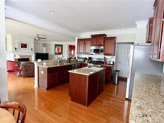 Popular ranch floor plan w/2234 sq. ft & a full basement! Enjoy sunrises from the deck/patio w/waterfall & sunsets from the front porch -the only one in all of the ranch homes! The breakfast nook and master bedroom have bay windows for additional natural light and space. Kitchen includes granite countertops, under cupboard lighting, and gas stove. Cuddle up in front of the gas fireplace in the great room. Master has lg. wic, dbl sinks, shower and jutted tub. Check out the dining room, Butlers pantry, sunroom, hardwood/tile floors, pillars, plus crown moulding in every room. Dry bsmt includes water softener and sump pump w/battery back up. Beautifully landscaped raised beds w/lighting, irrigation and fully fenced backyard. 3 car garage.