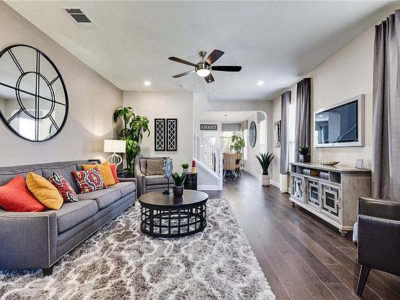 This beautiful two-story former model home features an open floor plan with 9-ft. first-floor ceilings. The roomy kitchen showcases Woodmont Shaker-style maple cabinets in North Sea, granite countertops, tile backsplash and a dining nook. The downstairs master suite offers a large walk-in closet, while the master bath boasts Silestone® countertops, a dual-sink vanity, tub and separate shower with tile surrounds. Upstairs, a game room provides an alternate entertainment area. Additional features include plush Shaw® carpeting at game room and bedrooms, tile flooring at full baths, wood flooring throughout the downstairs living areas, white 2-in. wood blinds, Generation Lighting fixtures, a yard sprinkler system and smart thermostat. Entertain family and friends on the back covered patio.