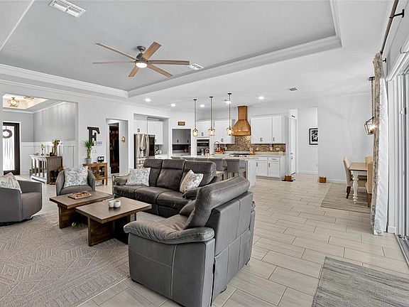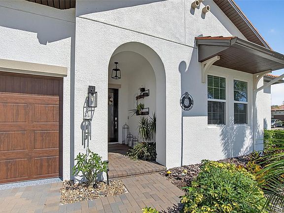 Experience resort-style living in Medley at Southshore Bay, a premier 55+ active adult community! This elegant 4-bedroom, 3-bathroom home with a 3-car garage showcases an open floor plan filled with high-end finishes and luxury tile plank flooring throughout. The heart of the home is the expansive kitchen, featuring quartz countertops, modern cabinetry, stainless steel appliances, a large center island, and both a walk-in and butler’s pantry for added storage and prep space. The kitchen flows effortlessly into the dining and living areas, creating the perfect atmosphere for everyday living and entertaining. The split-bedroom design offers privacy for everyone. The spacious primary suite includes a spa-like ensuite with dual vanities, a large walk-in shower, and an oversized walk-in closet with direct access to the laundry room. Bedrooms 2 and 3 share a convenient Jack-and-Jill bath, while Bedroom 4 is tucked away with a nearby full bath—ideal for guests or in-laws. Step outside to your private retreat featuring a luxurious pool and spa surrounded by a large screened-in patio with tiled flooring and cooling ceiling fans—perfect for relaxing afternoons or hosting gatherings year-round. Life in Medley is about more than just the home—it’s about the lifestyle. Residents enjoy both manned and unmanned gated entrances for secure, easy access, as well as golf-cart friendly paths and trails for exploring the community. The private clubhouse is the social hub, offering a café and bars, billiards, card and game rooms and a formal ballroom for special events. A monthly calendar of activities keeps the community buzzing with energy, offering everything from karaoke nights and comedy shows to live bands, as well as special interest and social groups—including men’s cigar gatherings and several hobby clubs that make it easy to connect with neighbors. Outdoor recreation abounds with pickleball and bocce courts, a dog park, a convenient dog bathing station, walking trails, and a resort-style heated pool—all just steps from the incredible 5-acre Metro Lagoon by Crystal Lagoons. With HOA fees covering internet, basic cable and lawn care, you can spend less time on chores and more time enjoying the endless activities at your fingertips. This move-in ready home offers the perfect blend of luxury, convenience, and community—where every day feels like a vacation.