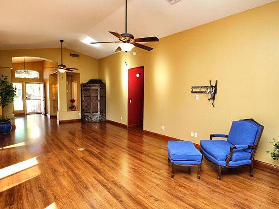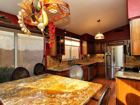 Sophisticated, yet casual this 2-BR, 2-bath Valencia model has a small den as well. Wood look laminate flooring gives the richness of hard wood without the maintenance. Over-sized matching wood trim gives the home a rich finish. Awesome updated kitchen with fabulous granite, gorgeous cabinets with really cool pullouts and lighting, a neat counter-height table with stools and copper pot rack. Both bathrooms have been upgraded with a farm sink vanity in the guest and two separate vanity sinks in the master. Very nice, updated lighting and ceiling fans throughout. Sensual colors lend an aura of opulence to the styling. Step outside & enjoy your view of the fairways, 14th green, 15th tee and ponds. Plenty of room to entertain on the extended patio!