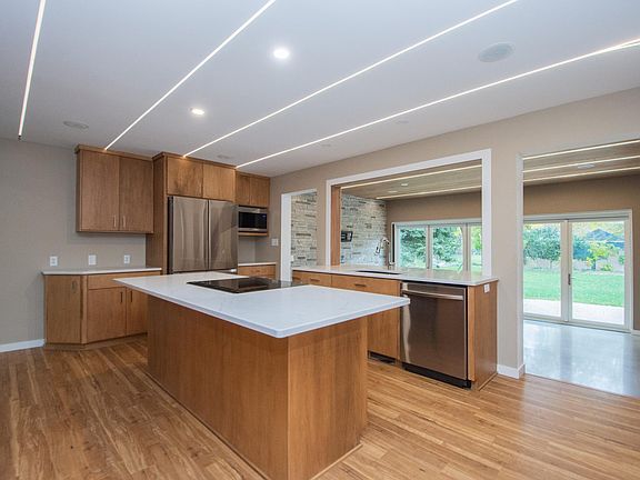 Welcome to this beautifully updated home in a fantastic neighborhood close to schools and retail shops! Enjoy a huge yard with a newly planted lawn (2023), a spacious backyard patio, and a serene, shaded area perfect for a hammock. Inside, you’ll find 4 large bedrooms with custom closets, new carpet, fresh paint, and updated doors and windows. The home features two stunning tile showers—one upstairs and one downstairs—and a massive family room for gatherings. The sunroom boasts a polished concrete floor, stone accent wall, a custom Bavarian wood ceiling, and a giant multi slide patio door leading outside. The kitchen is a showstopper with brand-new custom cabinets, quartz countertops, and all new stainless steel appliances. A large countertop extends into the sunroom for barstool seating and entertaining, complemented by a stylish bar area. Additional highlights include a large laundry room with plumbing for a dog wash station, new furnace, new hot water heater, new pex plumbing, new insulation, new lighting, a panic/storage room, and tons of cabinet space throughout. The oversized garage is perfect for RV storage, featuring two 8’ doors and two story high ceilings, upstairs bonus room, a roughed in elevator, and hookups for in floor heat. Outside upgrades include new shingles on the house and a metal roof on the garage (2023), new driveway and patio (2022–23), and a new central air unit. This home truly combines comfort, functionality, and style—ready for you to move in and enjoy!