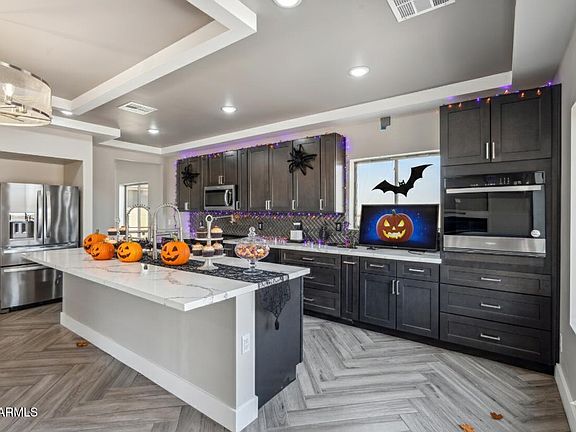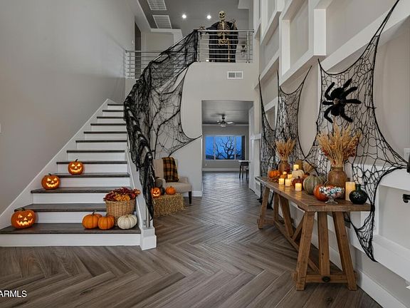 HIGHLY MOTIVATED SELLER! Experience unparalleled contemporary luxury in this fully remodeled 5,000 sq ft home, meticulously redesigned for multi-generational living and grand-scale entertaining. A breathtaking 20-foot accent wall and modern metal stair railings greet you as you enter, with herringbone flooring guiding you through the open layout. The gourmet kitchen is a chef's dream, featuring dual islands, two ovens, a pot filler, and stunning quartz counters with beutiful veining. The flexible floor plan offers dual primary suites and a mother-in-law suite for ultimate comfort and privacy. Enjoy oversized bedrooms, a spacious loft, and a large laundry room. With no rear neighbors and desert views, this masterpiece offers a unique blend of elegance and functionality