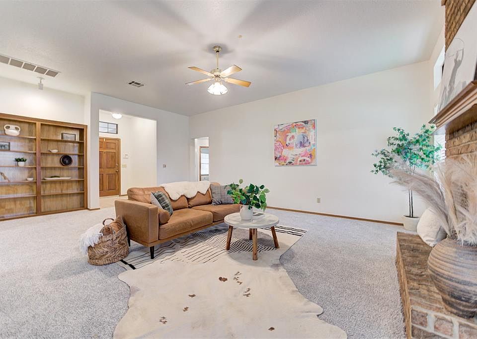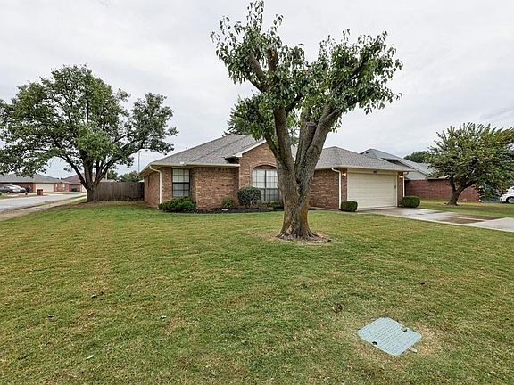 Enjoy the outdoors in the backyard, complete with a covered porch and plenty of space for gardening or entertaining. Additional highlights include an in-ground storm shelter in the garage, in-ground sprinkler system, and close proximity to the neighborhood playground and pool.