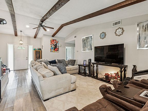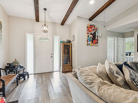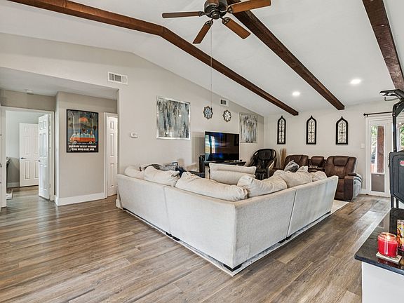 Welcome to this beautifully remodeled home with a sparkling pool in Corinth Shores Estate. This three bed, three bath home boasts a large living area with cozy fireplace, a large dining area, and updated kitchen with skylight. The entire home has been fitted with luxury vinyl plank flooring for stylishness and durability. The primary suite is complete with a new ensuite bath and walk-in closet. Stepping into the back yard, you can enjoy the covered patio, beautiful pool, fresh sod, and extra parking perfect for a boat, RV, or trailer. For additional peace of mind, the HVAC, windows, water heater, and appliances are approximately two years old. Solar panels help to keep the electric bill to a minimum. Home is conveniently located just seconds from I-35 and is an easy drive to downtown Denton for shopping and dining options.