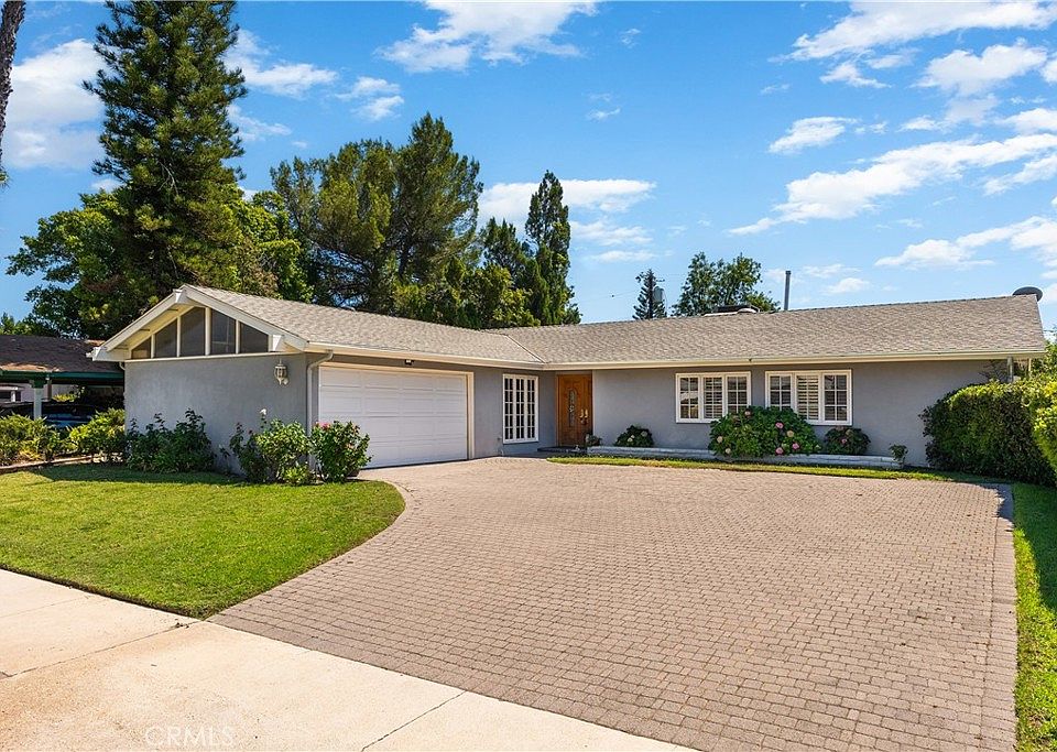 Located in a desirable neighborhood of Granada Hills, north of Rinaldi and west of Balboa, is this well-maintained single-story family home. The beautiful stamped concrete driveway contributes to the 10+ curb appeal. As you step through the double door entry you notice the beautiful light hardwood floors that flow throughout the main living spaces. Spacious living room features a brick fireplace and dining room that is large enough for those big family gatherings. The kitchen features a sub-zero, bay window, built-in appliances, pantry and breakfast area. Primary suite, with attached bath, has a sliding door to garden and spacious closet. 3 guest rooms share a remodeled bath. One bedroom was used as a den and has a closet “behind” the bookshelves, clever. Central Heat and Air, Solar ($114.00) per month. Low maintenance yard perfect for grilling. 2 car garage attached with direct access into home. Located within an excellent school district, including the highly acclaimed Granada Hills Charter High School. This is move-in ready. Everything has been painted freshly white - ready for someone to make it their own.