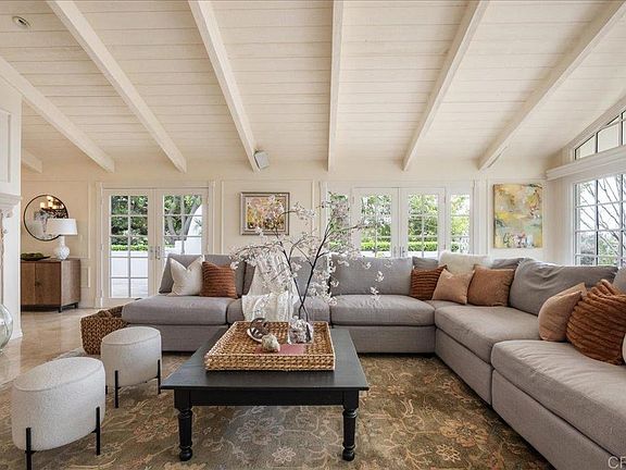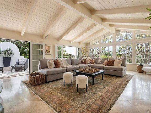 This opulent single-story executive home resides within the prestigious Rancho Santa Fe Covenant. Infused with a touch of French Provincial charm, it boasts exquisite craftsmanship evident in its wainscoting, beamed ceilings, quality built-ins, unique coved ceilings, and meticulous hand-painted details throughout. Luxurious marble-clad bathrooms, a custom chef's kitchen, a dual fireplace in the living and dining areas, newer A/C, and numerous French doors are just a few of the remarkable features of this home. South facing orientation with soaring vaulted ceilings and expansive windows flood the interiors with natural light, creating an airy ambiance. Outside, the low-maintenance, secluded backyard with its private pool creates a serene oasis for relaxation. Conveniently located a mere 3 minutes from Roger Rowe Elementary and the charming RSF Village, featuring an array of restaurants and boutiques. Additionally, residing within the Covenant grants social membership to the esteemed RSF clubhouse and the opportunity to acquire a golf membership.
