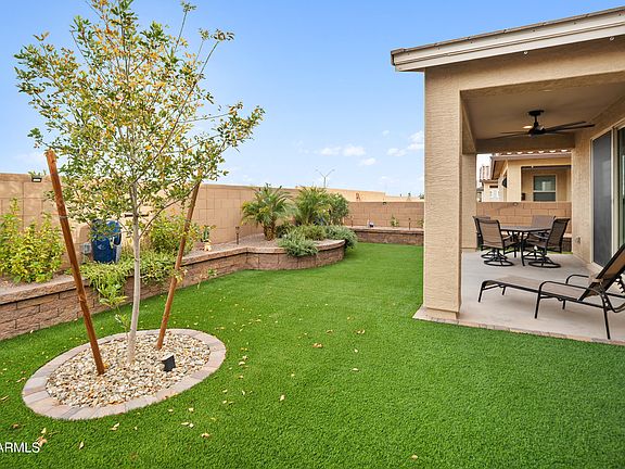 Charming single-owner 2-bedroom, 2-bath home in the 55+ community of Heritage in Surprise. The spacious great room overlooks a private backyard, while the kitchen features rich brown cabinetry, quartz counters, a gas stove, and stainless steel appliances. A cozy dining nook offers a custom feature wall and stylish lighting. The large primary suite includes a custom barn door, dual sinks, vanity area, and a tiled walk-in shower. Enjoy the covered patio, low-maintenance turf, and raised planters with mature shrubs and trees. Community amenities include a beautiful clubhouse, heated pools, pickleball courts, and dog parks—perfect for active adult living.