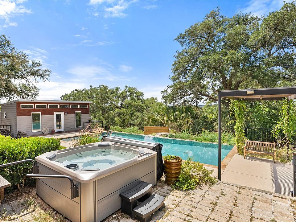 Tucked away on one of the most coveted cul-de-sac lots in Goldenwood West, this rare single-story estate offers the perfect blend of Hill Country serenity and modern comfort. The main residence features three spacious bedrooms plus a dedicated study, high living room ceilings, and an open, light-filled layout designed for both everyday living and entertaining. A true standout, the property also includes a fully appointed one-bedroom, one-bath guest house that is ideal for extended family, visiting friends, or private office space. Step outside to your designer pool and expansive back patio, where unobstructed Hill Country views create a breathtaking backdrop for sunsets and starlit evenings. The lush, oversized grounds provide both privacy and room to roam, while the high-end finishes throughout the home exude warmth and sophistication. With its combination of indoor elegance, outdoor beauty, and flexible living options, this property is a rare opportunity to own the very best of Goldenwood West.