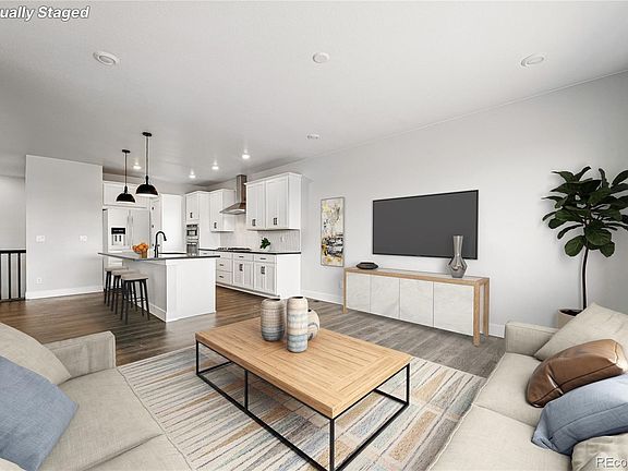 MLS#9970789 New Construction - Ready Now! The Maroon Bells floor plan at Trailstone is designed for comfort and versatility. Just off the foyer, two private bedrooms with a full bath offer a welcoming retreat for visitors or use as a space for an office. The kitchen, the true heart of the home, flows seamlessly into the dining area and great room, creating an open and inviting space. Plus, every home includes an unfinished basement—perfect for storage, a home gym, or a second office. Structural options added include: outdoor living area.