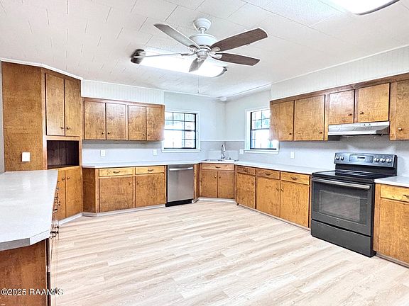 Over 2000sf! 1.5 acres! This solidly built and recently updated country home features ALL NEW flooring and NEW paint throughout! The kitchen is absolutely stunning with stained solid wood cabinetry, expansive countertops, and a walk-in pantry so large you can buy in bulk. Appliances include a stainless refrigerator, dishwasher, and electric range. The open-concept layout connects the kitchen to a great dining area and sizable living room having a built-in entertainment niche which can house a wide screen TV and other electronics. Just off the kitchen is a versatile FLEX SPACE, with its own exterior entrance, providing endless possibilities...a home office, play space, or creative studio. The special features don't end there! The primary bedroom features a large walk-in closet and bath having a vanity with an extended countertop, a tub/shower combination, and direct access to the laundry room! (No more hauling clothes across the house ;) The laundry room also includes a bonus area with storage shelves and a full size stainless freezer. The other 2 bedrooms each have their own special features...Bedroom 2 offers a large walk-in closet, while Bedroom 3 provides a built-in desk with shelves, and a conventional wall closet. Thoughtful details, such as a built-in bookshelf/cabinet in the hallway, and ample storage spaces throughout, highlight the custom qualities built into this home. You'll love the 21/2-car carport which is 24' x 29' wide!! Under roof is a 4 x 19 storage, and in back is a 9 x 20 covered back patio overlooking the beautiful yard. Adjacent fields seem to go on forever, and sunrises and sunsets are gorgeous out here! Out back, a metal building offers more storage..perfect for lawn equipment. Property is in Zone X, and the home is high and dry since the day it was built. This beautiful home is exceptionally constructed, thoughtfully designed, and now updated to make you feel right at home!!
