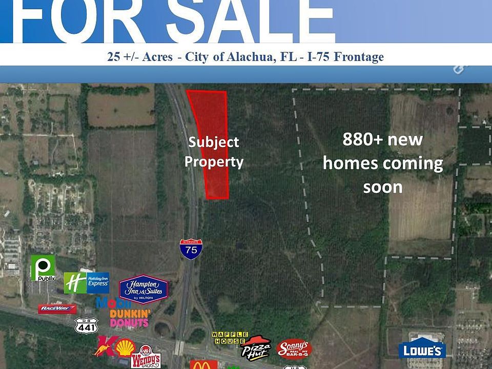 25 +/- Acres of land located near the I-75 and US Hwy 441 Intersection in Alachua. Over 2,500ft of I-75 frontage. Rapid recent growth in the City of Alachua makes this property prime for development. Great opportunity!
