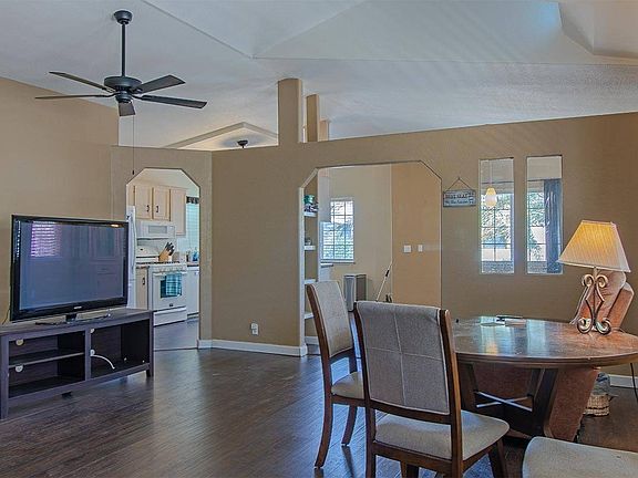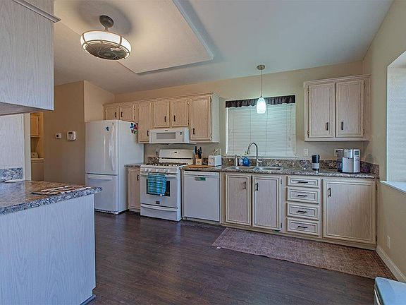 1368 sq. ft. 2 bedroom 2 bathroom manufactured home For Sale in a 55+ gated land lease manufactured home community. This home is located on an elevated home-site with low-maintenance landscaping. There is on-site covered parking under the attached full-length carport. There is also a matching shed at the end of the driveway and a covered front patio. There are no homes behind this home, only on each side. This floor-plan has a front dining room and kitchen. The home has full tape & textured drywall, 6inch exterior walls, and vaulted ceilings throughout. The ceiling texture is knock-down texture not popcorn. Laminate flooring has been installed throughout most of the home with carpet in the master bedroom only. The living room in this home is very spacious and includes a very unique dormer window. The dining room area is also very spacious and includes 2 built-in corner hutches with lighting. The dining room has direct access from both the living room and kitchen. The kitchen is full of cabinets and has plenty of counter space. There is even room for a small table and chairs in the kitchen of desired. All of the existing major kitchen appliances are included. The laundry room is at the rear of the kitchen and just inside the back door. There are additional cabinets above the washer and dryer and the existing washer and dryer are also included. The kitchen also has direct access from the living room. The guest bedroom is through the French doors in the living room. It has a large reach-in closet with sliding doors. The The guest bathroom is just across the hallway and it includes a 1-piece tub/shower combo, vanity, and a linen cabinet above the toilet. There is a large linen closet in the hallway directly across the hall from the guest bathroom. The master bedroom is located at the rear of the home. it is king-size and includes a walk-in closet with mirrored closet doors, a ceiling fan and an en-suite bathroom. The master bathroom includes a double-sink vanity a 3 door linen cabinet, and both a garden tub and separate shower stall. The roof was replaced February 2024. The A/C unit and furnace were recently replaced as were the countertops, laminate flooring, refrigerator, and microwave. The home is competitively priced and in nice condition.