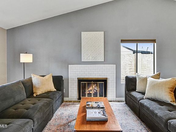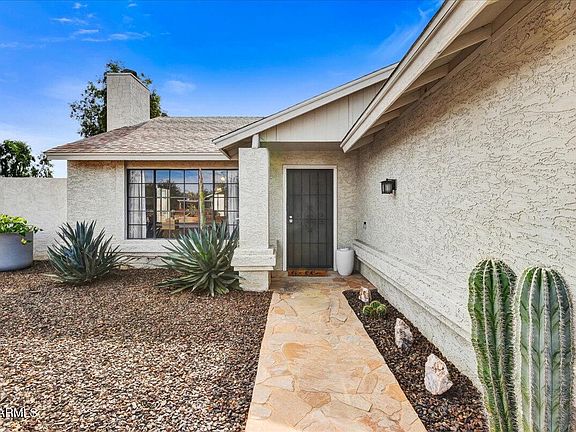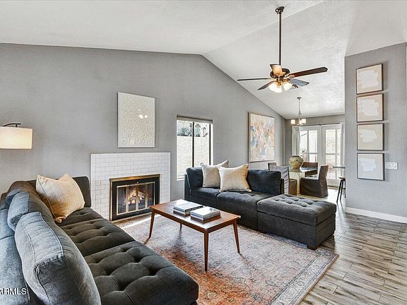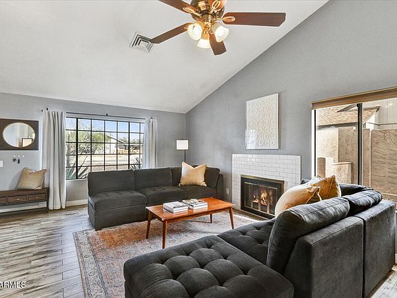 This charming, updated 3 bedroom, 2 bath ranch-style home with a 2 car attached garage is nestled on an expansive lot, complete with an RV gate and mountain views, within the desirable Paradise Valley School District. A picturesque flagstone walkway gracefully guides you to the inviting front entrance. The home boasts soaring vaulted ceilings, elegantly updated plank tile flooring, an abundance of natural light, and a cozy wood-burning fireplace that adds warmth and character. The modernized kitchen is a culinary delight, featuring updated white cabinetry, luxurious quartz countertops, and stainless steel appliances, creating a perfect blend of style and functionality. The primary suite is a private retreat, featuring a spacious walk-in closet, a beautifully appointed ensuite bath, and a sliding glass door that opens to a covered patio overlooking the side yard with sunset views. The additional bedrooms are thoughtfully designed, each equipped with ceiling fans, generous walk-in closets, and large windows that flood the rooms with natural light. The expansive backyard is an entertainer's paradise, offering multiple covered patios, a wood-burning fireplace, majestic palm trees, a turf side yard, and access to the RV gate. This property is designed for low-maintenance living and is situated in a prime location that provides easy access to local shopping, dining establishments, the greenbelt, and multiple parks for outdoor adventures, including hiking and biking.
