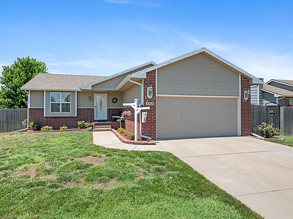 Welcome to 1713 E Winterset in Goddard! This charming 4-bedroom, 3-bath home offers an inviting and comfortable living space. The main level features luxury vinyl flooring and neutral painted walls, creating a modern and welcoming atmosphere. You'll appreciate the convenience of main floor laundry and a beautifully appointed master bath. Another bedroom and bath complete the main level of this home! The finished basement offers great carpet and ample storage space, perfect for your needs. 2 more finished bedrooms, a quite large family room, and another full bath finish off the basement. Situated on a desirable corner lot in the Goddard School District, the backyard boasts a lovely pergola over the patio, providing a perfect spot for outdoor relaxation and entertaining. Well manicured landscape & fencing surround the home. Owners have taken such pride & joy into ownership and have made this home very special and ready for new owners! Don't miss the opportunity to make this wonderful house your home!