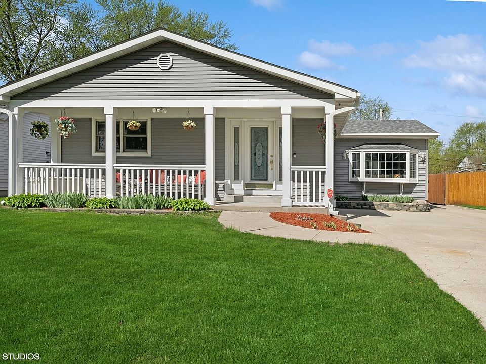 THIS LAKELAND PARK RANCH HOME CHECKS ALL THE BOXES! Flowing layout with 3 bedrooms, 1 1/2 baths, and a FENCED YARD with a fantastic outdoor oasis: expansive deck, beautiful yard, approx. 16'x10' gazebo and hot tub! Guests enter through a covered porch to a living room filled with natural light. You'll enjoy easy to maintain Pergo flooring throughout most of the home, including the 2nd and 3rd bedrooms. Kitchen is equipped with 2024 stainless steel refrigerator, range, built-in microwave and countertops + solid wood cabinetry that leads to a large Dining Room area with access to the deck and backyard amenities. Family Room includes a lovely bay window, crown molding and lots of space for all your media needs + French Door access to the patio. All three bedrooms feature great closet space and share a full bath. Laundry Room with full sized washer and dryer is centrally located in the main hallway. Detached approx. 26'x26' HEATED garage with polyaspartic-coated floor, (2) 220V outlets with dedicated 100amp service + extra space to store outdoor equipment and motorized retractable stairs leading to a generously-sized attic storage area. NEW 2025 water heater! 2022 HVAC replaced. 5 mins to Metra, multiple parks and McHenry Riverwalk downtown. Well-maintained home, but selling AS-IS. Property includes water rights to McCullom Lake! Roof & siding replaced in 2017.