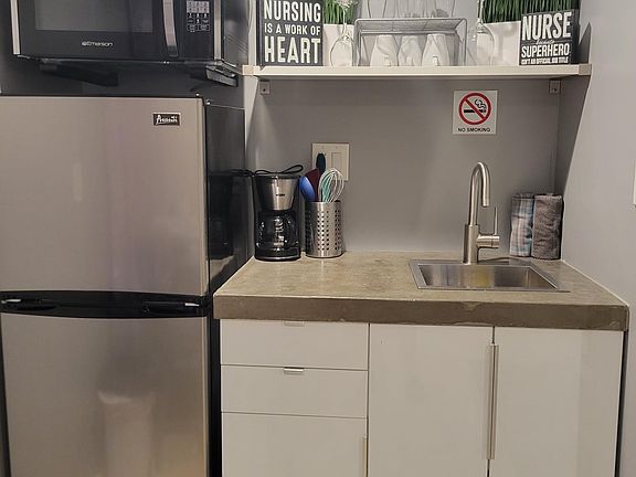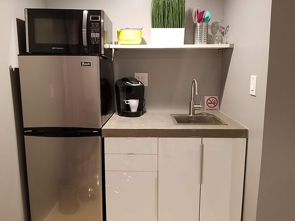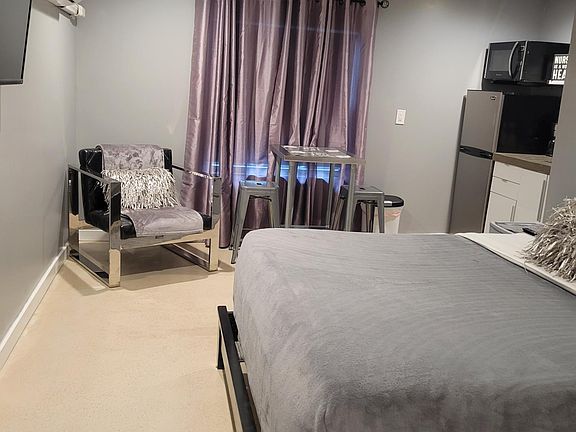This light and modern studio offer a functional kitchenette equipped with an apartment-size refrigerator, convection microwave, air fryer, and an induction hot plate. All the essential basics such as utensils, plates, silverware, and bedding are provided for your convenience. On-site laundry facility is available for your use. With a private entrance within a triplex property, this studio is ideal for a single occupant.