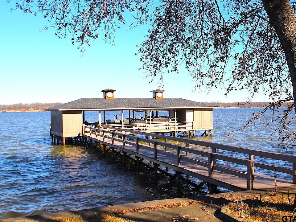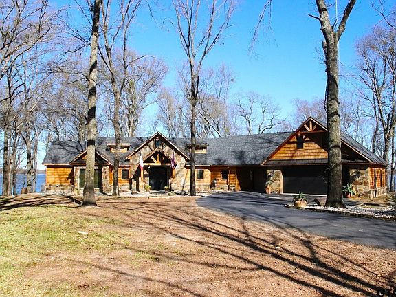 Discover your ideal waterfront retreat on Lake Fork! This custom-built 1,877 sq. ft. home offers breathtaking lake views from nearly every room. The design features a blend of alder, cedar, beech, and white pine woods, creating a warm and inviting atmosphere. A cathedral ceiling with exposed beams and recessed lighting adds architectural charm, while hardwood floors flow throughout most of the home. The living area centers around a stunning floor-to-ceiling stone fireplace. The open-concept living and kitchen space is perfect for entertaining, with a gourmet kitchen that includes granite countertops, ample cabinetry, a quartzite breakfast bar island, oil-rubbed bronze farmhouse sink fixtures, and stainless steel Jenn-Air appliances (gas range, oven, dishwasher, and microwave). A brick herringbone-pattern backsplash and cedar-plank vent hood add rustic elegance. The dining area, highlighted by a beautiful chandelier, is ideal for gatherings. The primary bedroom offers stunning lake views, an en-suite bath with a black granite vanity, oversized jet soaking tub, step-in shower, and spacious walk-in closet. The guest bedroom also has lake views, a stone accent wall, and a private bath. The utility room includes black granite countertops, cabinetry, a farmhouse sink, and ample storage. The 26’ x 26’ garage features a 12’ x 26’ drive-through boat storage, and the property has a 300-foot-long concrete retaining wall. The boathouse offers a pontoon boat stall with electric lifts and lighting, plus space for outdoor cooking and entertaining. This subdivision has one of the best private boat ramps for the use of the property owners and their guests. With spectacular water views and an inviting atmosphere, this home is ready for you to make it yours!