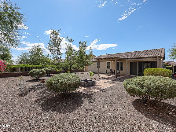 Inside, the open-concept great room welcomes you with warm tile flooring, abundant natural light, and a seamless flow into the kitchen and dining spaces. The kitchen is a true delight with granite countertops, natural wood cabinetry, and a spacious eat-in area that opens to the backyard for effortless indoor-outdoor living. The primary suite offers a relaxing retreat with ample space, dual sinks, and an oversized walk-in shower. Step into the screened-in Arizona room for year-round comfort - perfect for unwinding with a book or entertaining guests. The backyard is thoughtfully designed for both relaxation and gatherings, featuring an extended paver patio, pergolas for added shade, and a cozy firepit for cool desert evenings.