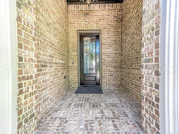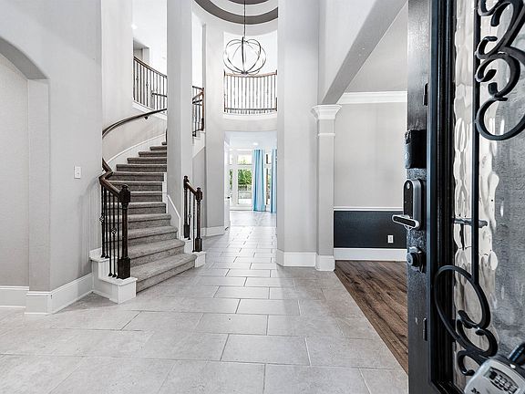 Stunning Bridgeland home next to a large park with lake access. Features fresh interior paint, beautiful landscaping, and a resort-style pool. Dramatic two-story entry with triple-vaulted ceilings, sweeping staircase, and upgraded tile/LVP floors. Spacious living room with expansive windows and custom drapes. Gourmet kitchen with massive island, brand-new custom backsplash, and ample cabinet space. First-floor primary suite offers a private retreat; upstairs includes three bedrooms, game room, and media room with built-in stage. New chandeliers and oversized fan add elegance. Backyard paradise boasts pool and spa with special-order glass tile, sundeck seating, firepit, premium turf, and professional landscaping—ideal for entertaining or relaxing.