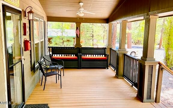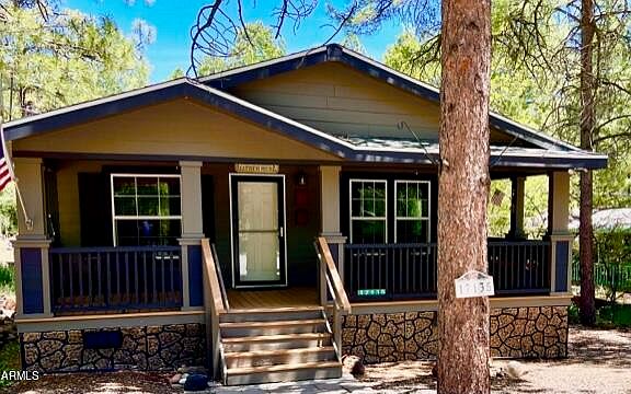 LARGER 3 bed 2 bath home located on a quiet cul-de-sac in Munds Park. Enjoy your summers or live year-round in this upgraded, fully furnished home that is full of windows, well-kept and very roomy! Large trex covered deck w/ ceiling fans, perfect for entertaining. Newer wood laminate flooring throughout, upgraded backsplash, breakfast bar, countertops, cabinets, AIR CONDITION, new window seals, extra windows and doors installed, separate master exit to back, master bath separate his/her vanity, upgraded showers w/glass doors, every room has ceiling fan, recessed lighting, master bath redone, huge master has built in cabinets and desk, separate laundry has walk-in closet and exit door to side, all doors have security doors, upgraded front glass security door, large shed, every room has a TV that stays. Home was re-leveled June 2022 and is move in ready! This home is 1.2 miles from the well-known Pinewood Country Club! It is also close to the national forest, lake, hiking/ biking trails, utv trails, park, restaurants, convenient store and more! Munds Park is only 17 miles south of Flagstaff and only a 2 hour drive from Phoenix to escape the heat! Come see your new home in our neck of the woods!