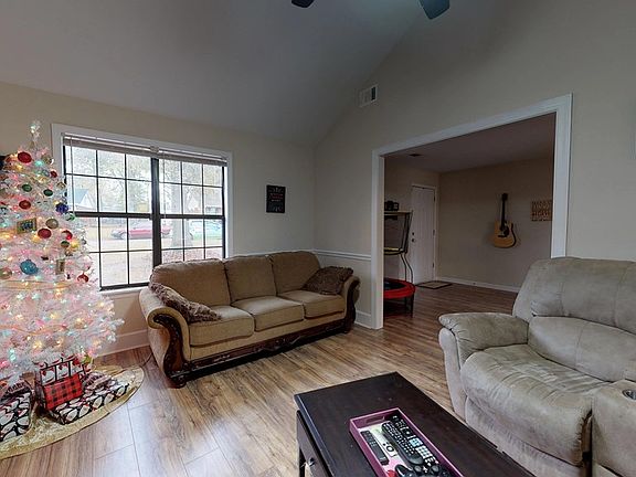 An attractive, brick exterior with welcoming front porch opens into the living room introduces beautiful, light-wood floors that carry a fresh, updated feel throughout the main living areas and bedrooms. To the right is a spacious great room with vaulted ceiling and brick fireplace framed with stately molding. Through the great room is the kitchen which boasts newer countertops, stainless-steel appliances and a lovely breakfast room with a bright bay window. The laundry room has outdoor and garage access. Past the centrally located hall bathroom is the owner bedroom, which features a tray ceiling with fan, a big closet and its own en suite full bath with a large garden tub. The remaining two bedrooms are convenient to the hall bath. Outdoors is a deck that overlooks a great backyard. Partial privacy fence and roof is only 2 years old. Check out the virtual tour to see more!