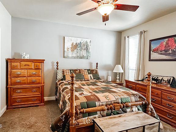 The primary suite offers a private retreat with dual sinks, a walk-in closet, and an attached bath. Step outside to enjoy true mountain living on the oversized, no-maintenance covered deck—ideal for entertaining or relaxing among the pines. Additional highlights include a fenced yard, two storage sheds, new carport, front pavers with fire pit, a separate laundry area with storage and new washer, and plenty of parking.