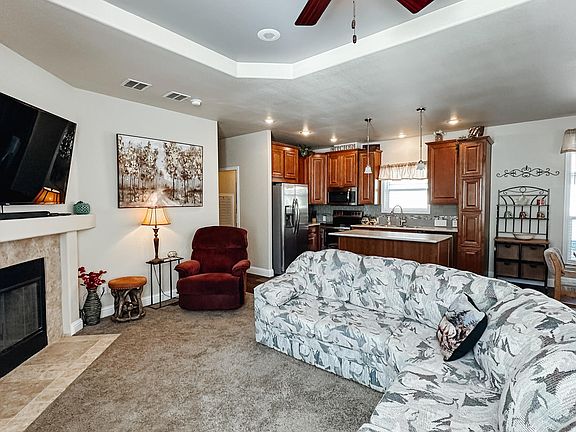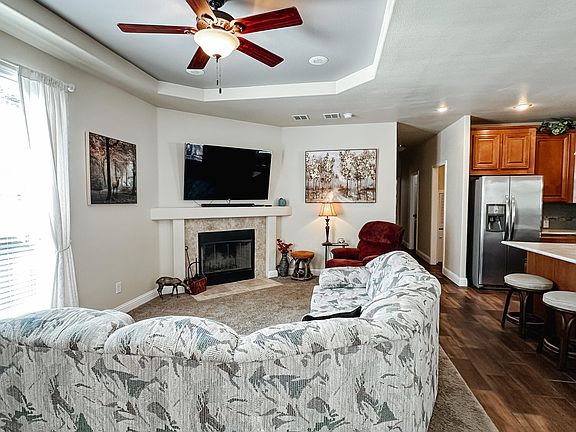 Beautiful wood-burning fireplaceOpen-concept layoutFenced yardPrimary suiteNew carportRecessed lightingWood cabinetry