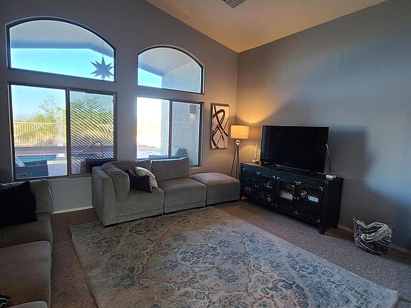 **Recent Price Improvement.** This 4 bedroom home features open concept space and soaring ceilings. Kitchen comes with updated Stainless steel appliances and refrigerator. Open Kitchen and Family/dining room with tons of windows. Huge separate living room space. Master suite opens to rear patio/pool and has a large on-suite bathroom with walk in closet. Owned Solar system will save you money with no lease payments. Water Softener installed and epoxied Garage floor. Amazing End of Cul-du-Sac lot that backs up to Protected Desert. Endless sunsets from Backyard and Sparkling Pool. Covered Patio and Covered BBQ ramada. Furnishings available via separate Bill Of Sale. Come see this home quickly as it will not last long on the market.