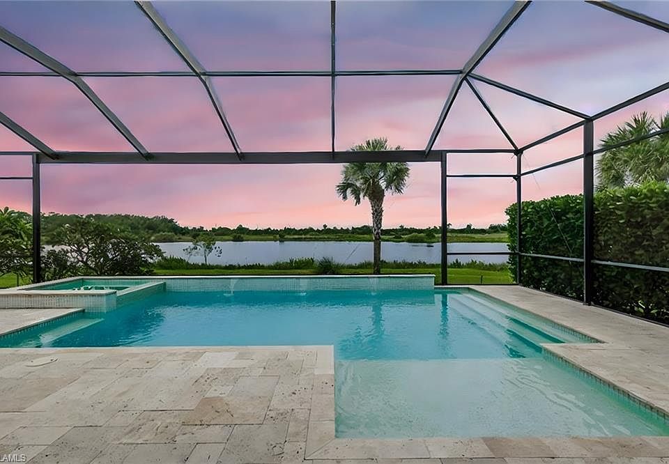 Exquisite Lakefront Retreat in The Place at Corkscrew! Welcome to this stunning 4BR + Den/Office, 3BA single-story home where timeless elegance meets modern luxury. Perfectly positioned on an oversized waterfront lot, this residence captures breathtaking lake views and showcases a heated saltwater pool & spa framed by lush tropical landscaping. From the very first glance, the professional landscaping, and custom glass entry door set the stage for the beauty within. Step inside to discover soaring 12' coffered ceilings, and plank tile flooring that flows seamlessly through the open-concept living spaces. Walls of 10' sliding glass doors invite natural light and create a graceful connection to the outdoors. The gourmet kitchen is a showpiece, featuring quartz counters, pull-out shelves and under-cabinet lighting, premium Whirlpool appliances, a custom walk-in pantry, and an oversized island designed for gatherings. The serene primary suite offers a true retreat with a tray ceiling, plantation shutters, and a spa-inspired bath boasting a soaking tub, frameless glass shower, and expansive walk-in closet. Outdoors, indulge in your private oasis with a spacious covered lanai, picture window screen, Storm Smart shade, and the sparkling heated saltwater pool & spa—all designed to maximize relaxation and panoramic lake views. Additional luxuries include a French-door den, a versatile planning center, and an epoxy-coated 3-car garage. Life at The Place at Corkscrew is unparalleled, offering resort-style amenities: a zero-entry lagoon pool with a 100-ft waterslide, state-of-the-art fitness center, tennis, pickleball, bocce, sand volleyball, dog park, playground, and multiple dining options including the Barefoot Bar & Grill, Bourbon Bar, and café. Conveniently located near a new Publix Plaza, RSW Airport, Miromar Outlets, and Gulf Coast Town Center, this home embodies the perfect blend of luxury, comfort, and lifestyle.