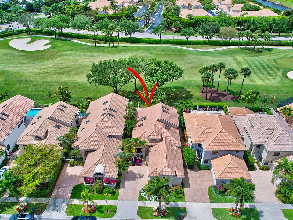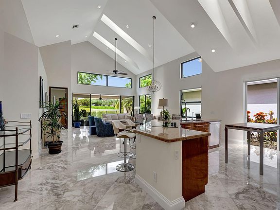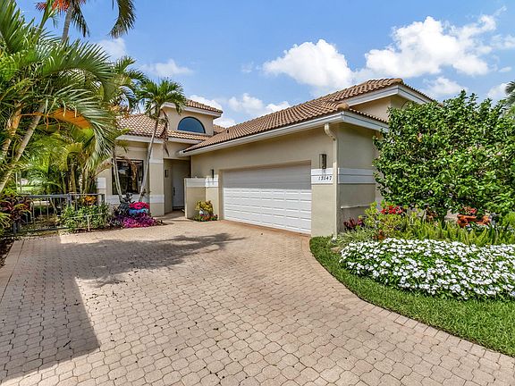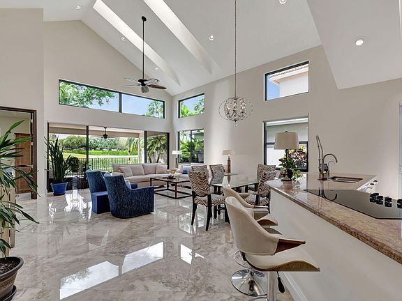 This single-story, updated home offers a blend of sophistication and tranquility. As you approach the driveway, your eyes are immediately drawn across the street to the picturesque lake, a serene backdrop that sets the tone for the luxury that awaits inside. Stepping into the foyer, you are greeted by vaulted ceilings that soar above. Skylights bathe the interior in natural light, illuminating the open concept designed for seamless entertaining. Every detail of this updated abode exudes thoughtfulness, from the custom layout to the high-end kitchen appliances and walk-in pantry. It's the panoramic view of the lush, sprawling golf course that truly steals the show, a masterpiece framed by the expansive windows of the living space. The patio is an extension of the home and creates an outdoor living room to relax and watch the sunsets in the distance. The primary suite offers a sanctuary with its private vista of the golf course, access to the patio, two walk-in closets, and a spacious bathroom complemented by dual sinks and a separate tub. The split floor plan offers another separate ensuite bedroom, ensuring privacy and comfort for guests. A third bedroom, complete with a built-in desk, provides versatility for a home office or study with an adjacent additional full guest bathroom. This home has been impeccably maintained and offers impact windows and numerous upgrades. A convenient laundry room adjoins the attached two-car garage. Located in the Hampton Court section of the award-winning Polo Club, a satellite pool is located just down the street, and a beautiful palm tree-lined street with gorgeous flowers. Enjoy country club living at its finest with access to the full amenities at The Polo Club Clubhouse such as the two championship 18-hole golf courses, an internationally awarded tennis/pickleball center, and a 145,000 SF Clubhouse with multiple restaurants, bars, gym/spa, aquatics center, and activities.