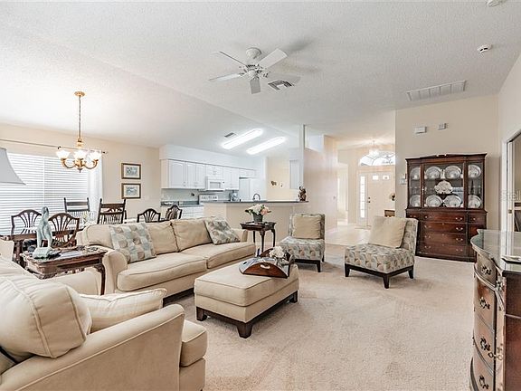 Mrs. Clean lives here! Bright and sunny open concept floorplan with neutral color scheme and high ceilings. Updates include: Roof replaced 4/2019; gutters replaced 5/2020; A/C replaced 2/2016; appliances replaced 6/2016; dryer replaced 9/2019; freshly painted exterior 2018. Spacious living room with dining area and floor-to-ceiling windows view backyard featuring an in-ground spa with screened-in enclosure. The kitchen boasts crisp, white cabinets and more than ample counter space. Den off the living room is being used as a home office. Oversized master suite offers room for a sitting area; master bathroom with double vanity and tiled, step-in shower. Walk-in laundry room with built-in shelving, and the washer and dryer are included in the sale. Your screened-in patio provides plenty of room for patio furniture and BBQ, this is a wonderful place to start or end your day! New hot water heater being installed. LIVE THE HERITAGE SPRINGS LIFESTYLE - Resort style living at its absolute finest! Clubhouse with restaurant and bar, fitness, tennis, golf, cards, billiards, dancing and more! SUPERB TRINITY LOCATION, CLOSE TO DINING, SHOPPING, MEDICAL AND AIRPORT! Caution - Adults at Play!