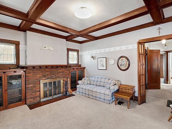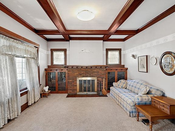 Stately 2 Story Home situated on 2 LOTS & just blocks from Lake! Impressive woodwork found throughout! Coffered ceilings, Built in bookcases, pocket doors & stunning cabinetry! BOASTING A NEWER ROOF, FURNACE & AC! 2 MAIN LEVEL Bedrooms, 3 Upper level bedrooms & 2 FULL BATHS give optimal living space! Heated enclosed front porch is the perfect place to relax! Living room Fireplace is flanked with built ins. Kitchen has all appliances included & side porch entrance! Hardwood throughout home & also under carpets. Large unfinished basement is perfect for storage! Main level has new windows! 1 car detached garage.