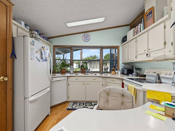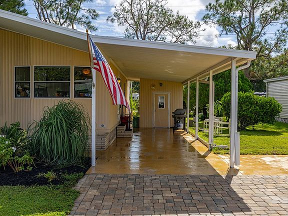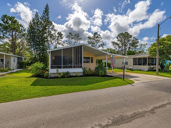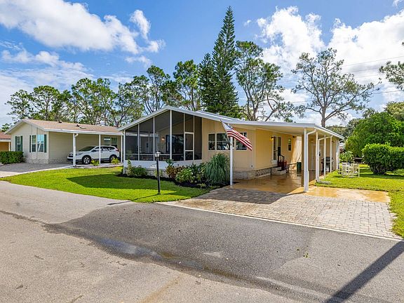 Experience the best of Florida retirement living in this beautifully furnished and meticulously maintained 2-bedroom, 2-bathroom home. Comfort is key in this turnkey residence, featuring a recently installed metal roof, brand-new carpet, and new ductwork for your complete peace of mind. The AC is serviced twice a year, ensuring a comfortable climate year-round. This home is ready for you to move in and enjoy. Enter a bright, inviting kitchen with a unique built-in curved desk and large windows that offer beautiful light and scenic views. Outside, the professionally landscaped yard provides a private oasis, complete with a lanai perfect for enjoying your morning coffee and a large storage shed for all your hobbies. The backyard is secured with an elegant iron fence. This community is more than just a place to live-it's a lifestyle. Your monthly lot rent of $1226.14 includes water, sewer, trash, and all of the incredible amenities. Enjoy a sparkling pool, relaxing spa, and 10 tiki huts, or get active with pickleball, cornhole, and mini-golf. The community also features a fully-equipped fitness room, a spacious clubhouse for events, a library, and a card room. Your furry friends will love the dedicated dog park and convenient dog washing station with a dryer. Additionally, there are monthly fees of $164.12 for cable and internet, $65.71 for share tax, and $11.82 for liability insurance. Schedule a showing today and take the first step toward making this exceptional retirement paradise your own!