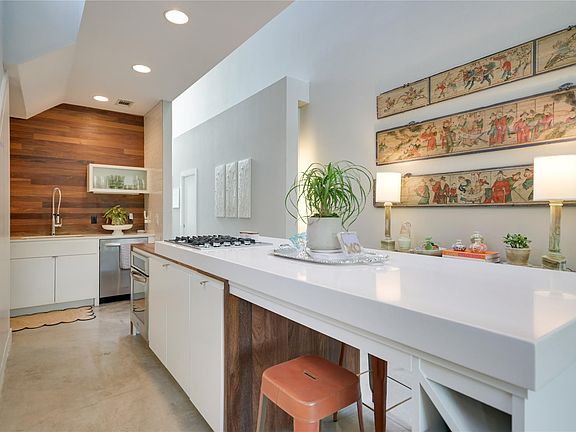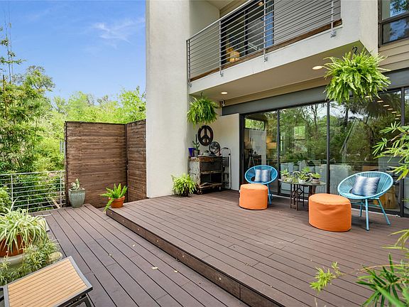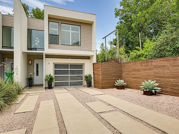 A sleek, contemporary townhome nestled in an authentic Austin neighborhood surrounded by original homes, long-time neighbors, and century-old pecan trees. Walking distance to the University of Texas, Cherrywood Coffeehouse, and all the fun, unique businesses evolving on Airport Boulevard, you will be in the middle of everything. The interior is uniquely designed to be architecturally interesting and filled with light. A skylit entry gallery leads the eye through the home to an oversized deck surrounded by greenery. Sleek European cabinetry and concrete floors are softened by Brazilian cherry accents. Two upstairs bedrooms are connected by a catwalk overlooking the gallery; both feature designer en-suite baths, and the guest bedroom opens to a creekside deck. Enjoy the best of Austin in this contemporary pied-de-terre in the heart of the city.